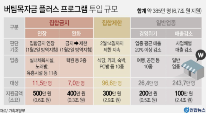 ▲노래연습장 등 집합금지(연장) 업종에는 500만원 지급